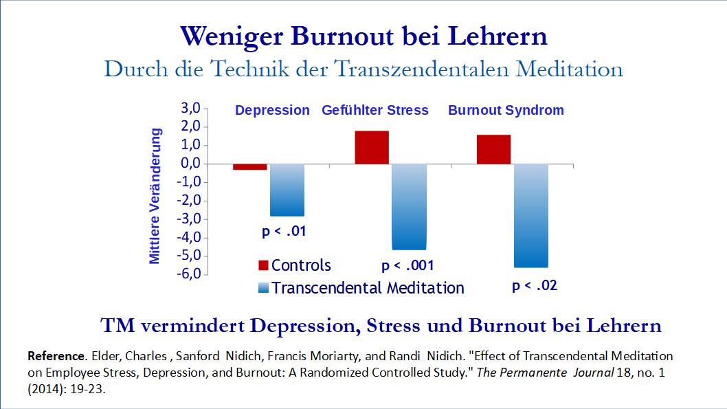 In einer Meta-Analyse von 146 neueren Studien zur Angstreduktion durch ver­schiedene Entspannungs-methoden war die Transzendentale Meditation (TM) bei weitem das effektivste aller Verfahren, um Stress abzugleichen und Ängste abzubauen.